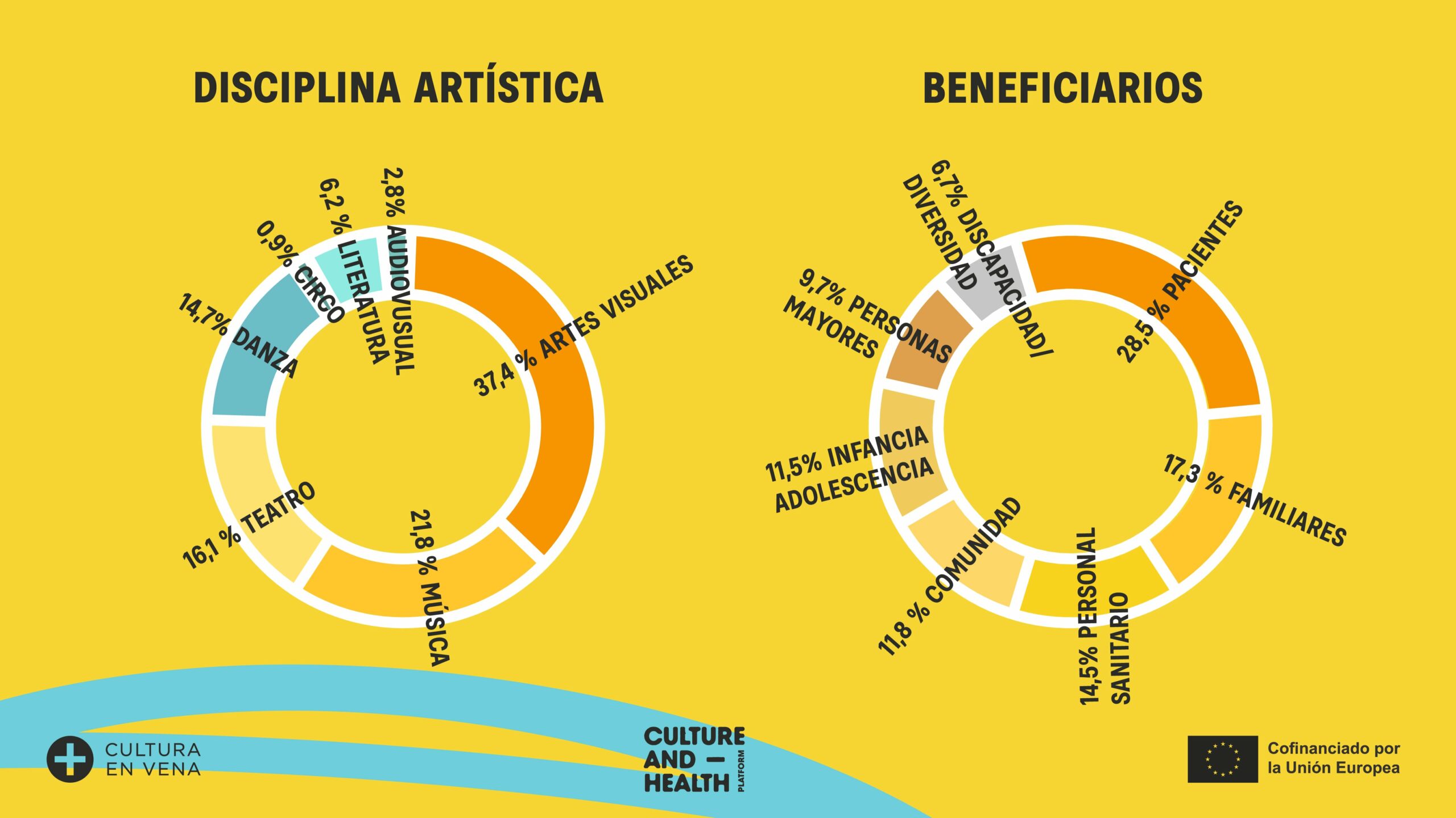 En cuanto a las disciplinas, las propuestas abarcan un abanico amplio de lenguajes artísticos. Las artes visuales encabezan el conjunto con un 37,4 %, seguidas de la música (21,8 %), el teatro (16,1 %) y la danza (14,7 %). Pero quizá el dato más significativo no sea solo cuál disciplina lidera, sino el peso de la hibridación: 103 proyectos, casi la mitad del total, son interdisciplinares, lo que confirma que, cuando cultura y salud se encuentran, los lenguajes se mezclan y se expanden.